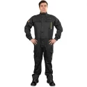 Suojaudu valokaarelta ja vähäisiltä hitsauskipinöiltä. Puvussa metallinen vetoketju peitetty tarrallisella tuulilistalla.